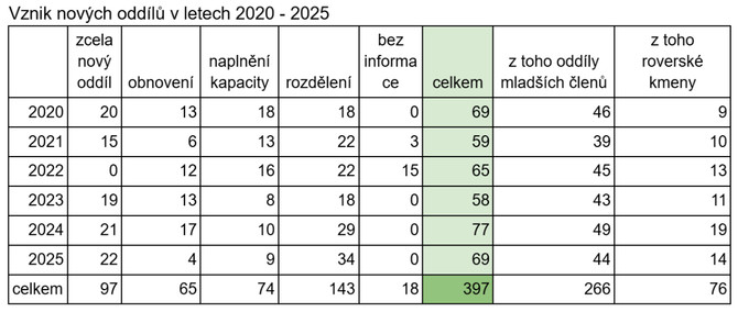 Ať už jde o nový oddíl v místě, kde dosud žádný nebyl, nebo o oddíly, které vznikly dělením.