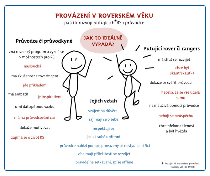 Průvodcem*průvodkyní může být starší rover nebo rangers, vedoucí roverského kmene, vedoucí oddílu, výchovný zpravodaj či výchovná zpravodajka, instruktor*ka z kurzu… Výčet není a nemůže být kompletní. Nejde totiž o jasně definovanou funkci, ale klíčovým faktorem je to, aby rover, rangers měli k průvodci*průvodkyni důvěru, aby pro ně byl*a přirozenou autoritou, od které se chce učit.