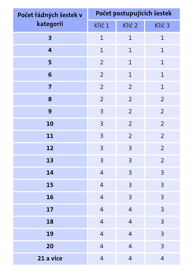 - Může si zvolit postupový klíč (klíč č. 1–3 z odst. 39) ze základních kol tak, aby počet šestek v krajském kole byl organizačně únosný.